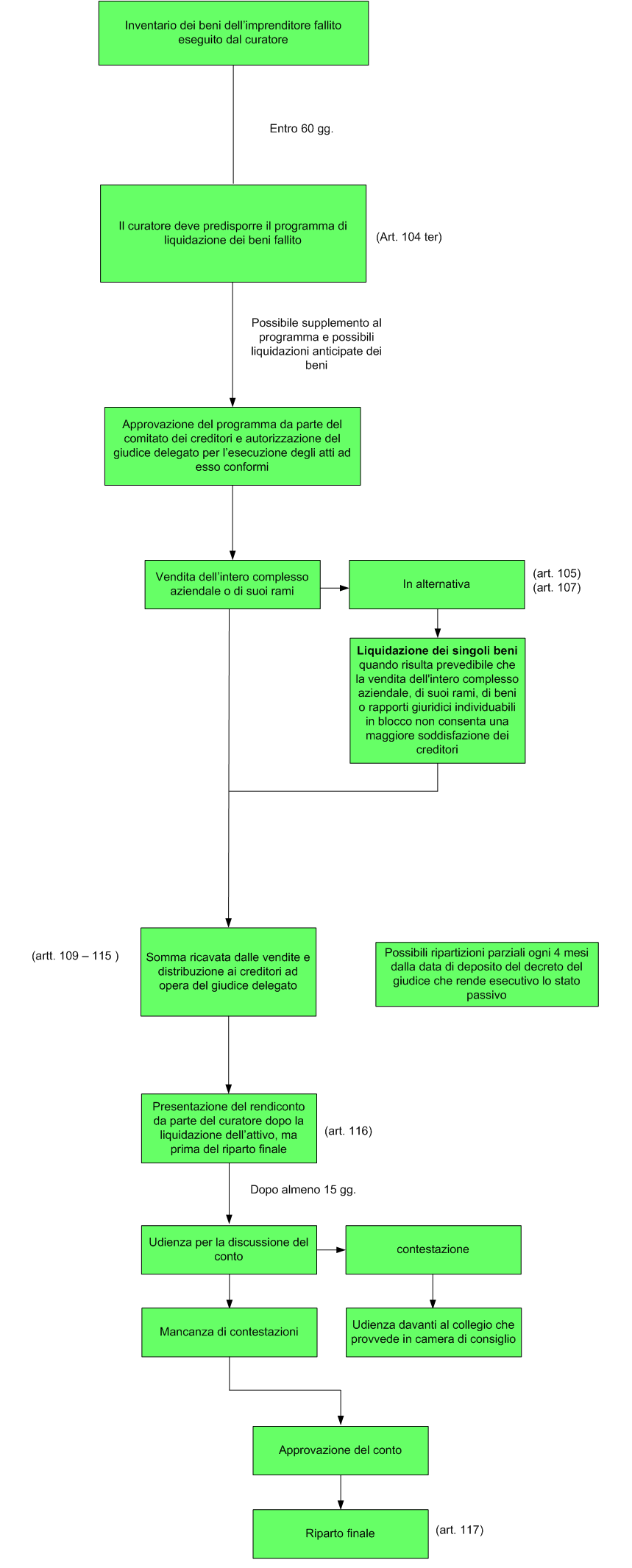 Vediamo, nello schema, i passaggi fondamentali della procedura di liquidazione dell'attivo(artt. 104 ter - 117 l.f.)